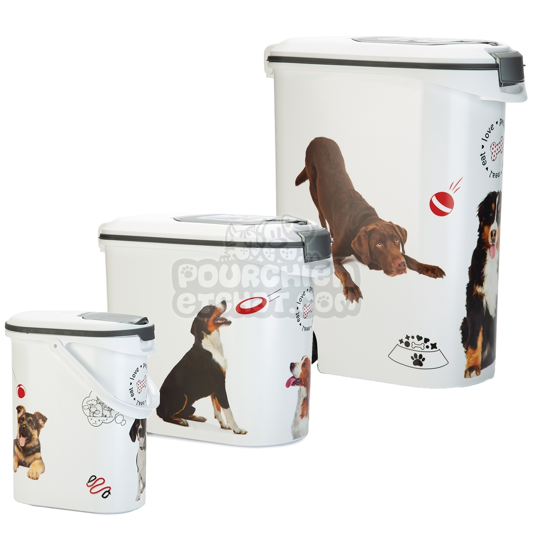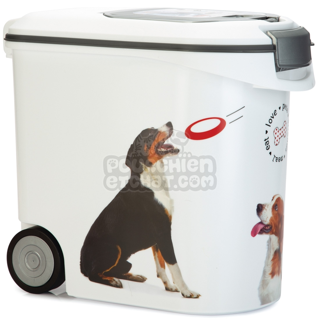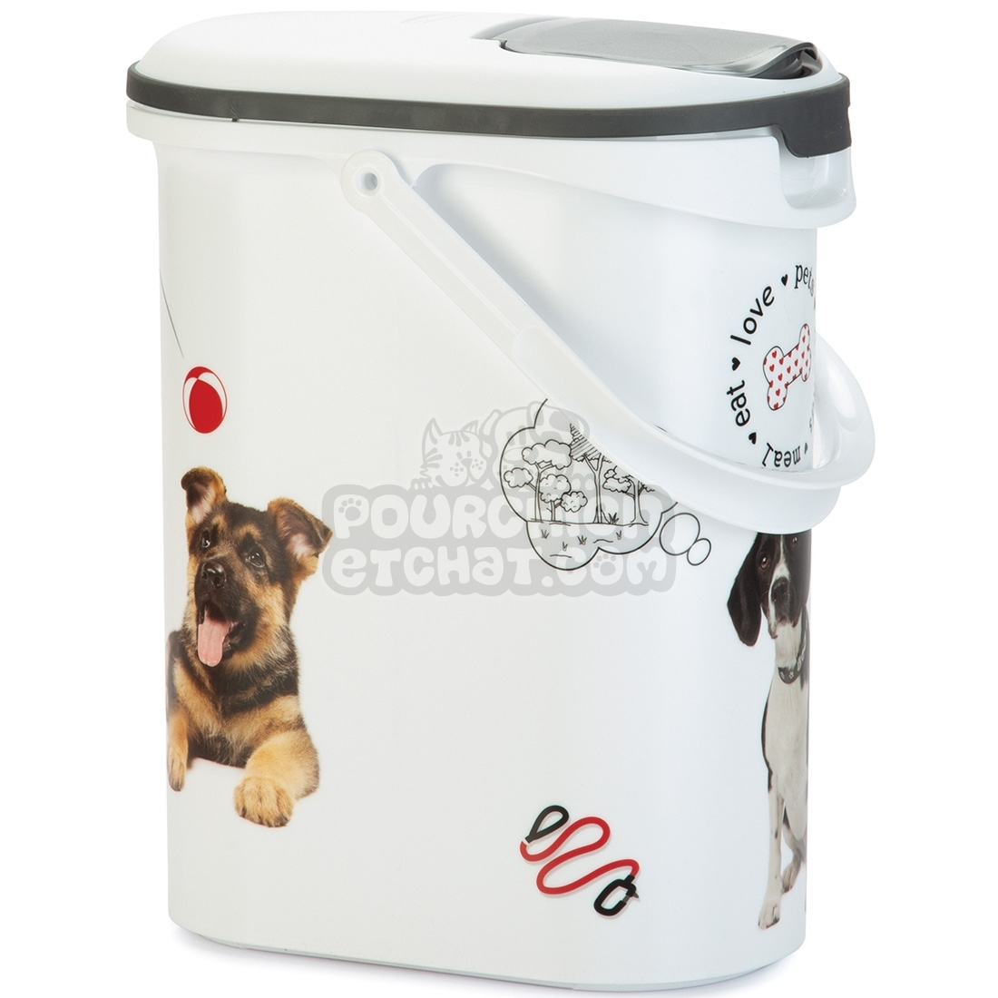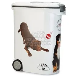 Le container à croquettes pour chien CURVER fabriqué en plastique, de couleur blanche est idéal pour le stockage des croquettes. Les façades du container sont ornées de chiens, ils apportent une nouvelle touche esthétique au produit sans parler des deux ouvertures présentent sur les containers : une petite pour une utilisation quotidienne, et une plus grande pour le remplissage. Le container à croquettes pour chien de la marque CURVER apporte une excellente conservation des aliments, cela grâce à un système hermétique de joints fixés sur les ouvertures. Produit disponible en plusieurs modèles de 4.5, 10, 35 et 54 litres ; les containers de 35 et 54 litres disposent de roulettes pour faciliter le déplacement.