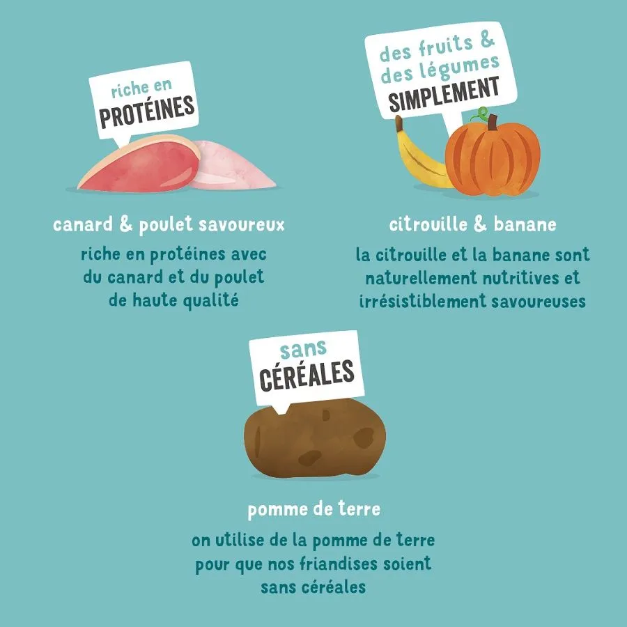 Préparées avec les meilleurs morceaux de canard et de poulet cuits en douceur, Les gourmandises sans céréales sont pleines de bienfaits naturels. De l’huile de colza est ajouté pour les rendre encore plus moelleuses, et du potiron et de la banane pour un supplément de bons points nutritionnels. Edgard & Cooper emballe les friandises dans des sacs 100% biodégradables, et – dernier détail mais pas le moindre – reverse 10% de ses profits à une clinique vétérinaire dédiée aux chiens au Sri Lanka.