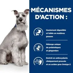 Sa formule contient la technologie des ingrédients Hill’s ActivBiome+. Il s’agit d’un mélange exclusif de fibres prébiotiques pour nourrir le microbiome intestinal tout en aidant à diminuer les troubles digestifs. Elle contient un mélange unique de prébiotiques et de gingembre.