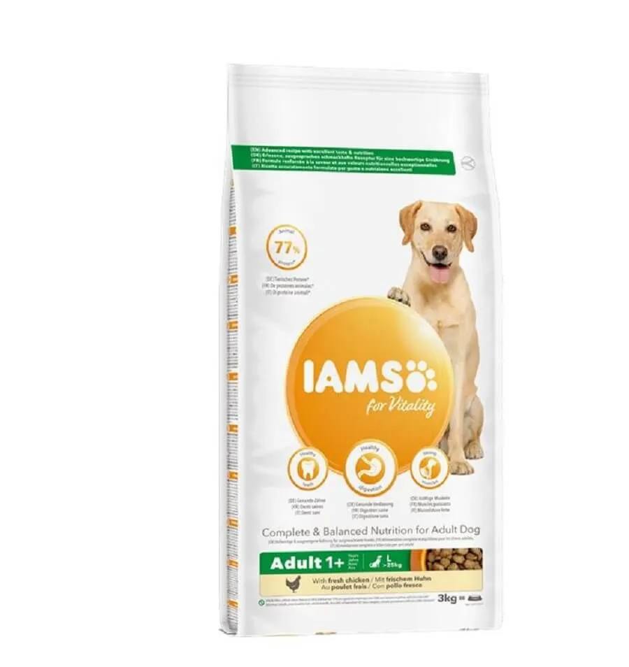 Iams Vitality croquettes chien adulte grande race est une recette au poulet frais recommandée pour les chiens adultes de grande race de 1 à 8 ans.