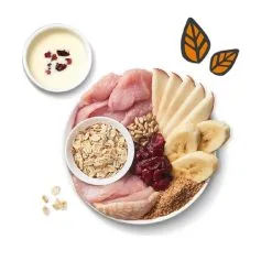 Elle comporte Ă©galement de dĂ©licieux fruits comme des baies ou des bananes, des graines de tournesol, de l’avoine, du yaourt, de l’huile de saumon et un mĂ©lange d’herbes aromatiques. Ces ingrĂ©dients sont sains, naturels et nutritifs.Â