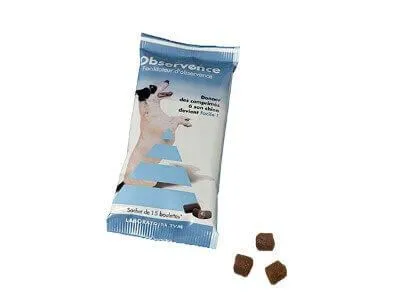 OBSERVENCE Boulettes est un aliment complémentaire qui permet d’enrober et de dissimuler comprimés ou gélules pour en faciliter la prise. L’odeur et la saveur correspondent parfaitement au goût du chien et la texture empêche l’animal de dissocier le comprimé ou la gélule de la boulette formée.
