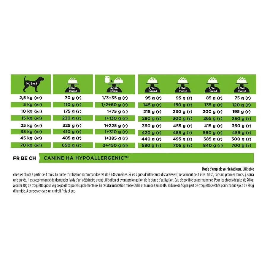 Purina Proplan Canine hypoallergenic est formulĂ© avec une seule source de protĂ©ines et des sources de glucides purifiĂ©s. De plus, les protĂ©ines ont Ă©tĂ© coupĂ©es (hydrolysĂ©es) en petits morceaux ce qui aide Ă limiter les rĂ©actions allergiques. Durant cette pĂ©riode d’essai, il est essentiel pour votre chien de le nourrir exclusivement avec Canine HA et de ne pas lui donner d’autres aliments ou friandises pendant 8 Ă 10 semaines.