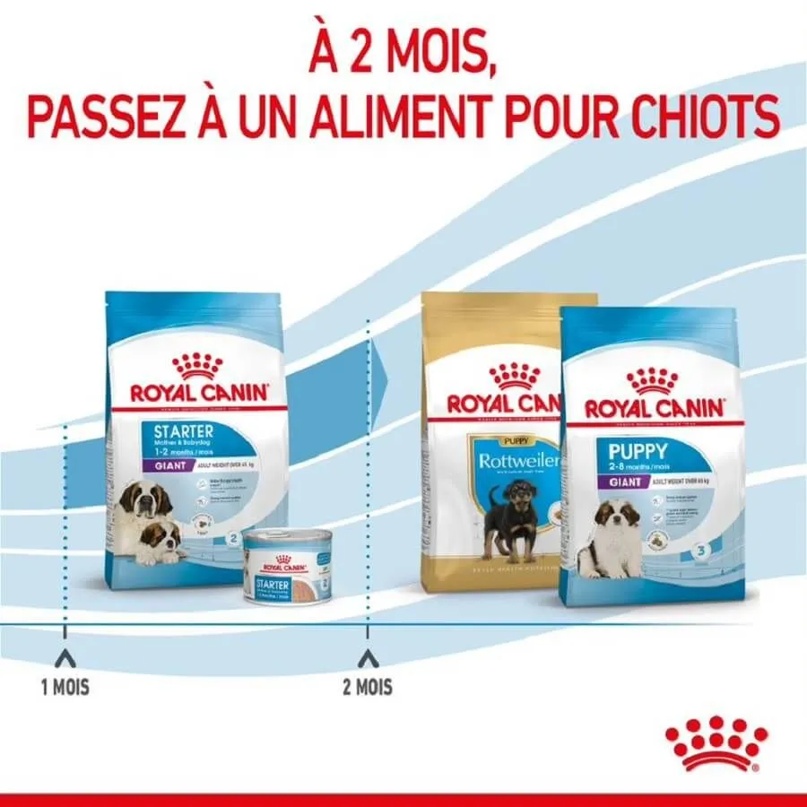 Les croquettes giant starter mother and babydog de Royal Canin offrent une alimentation complète et équilibrée pour les chiots de races maxi.