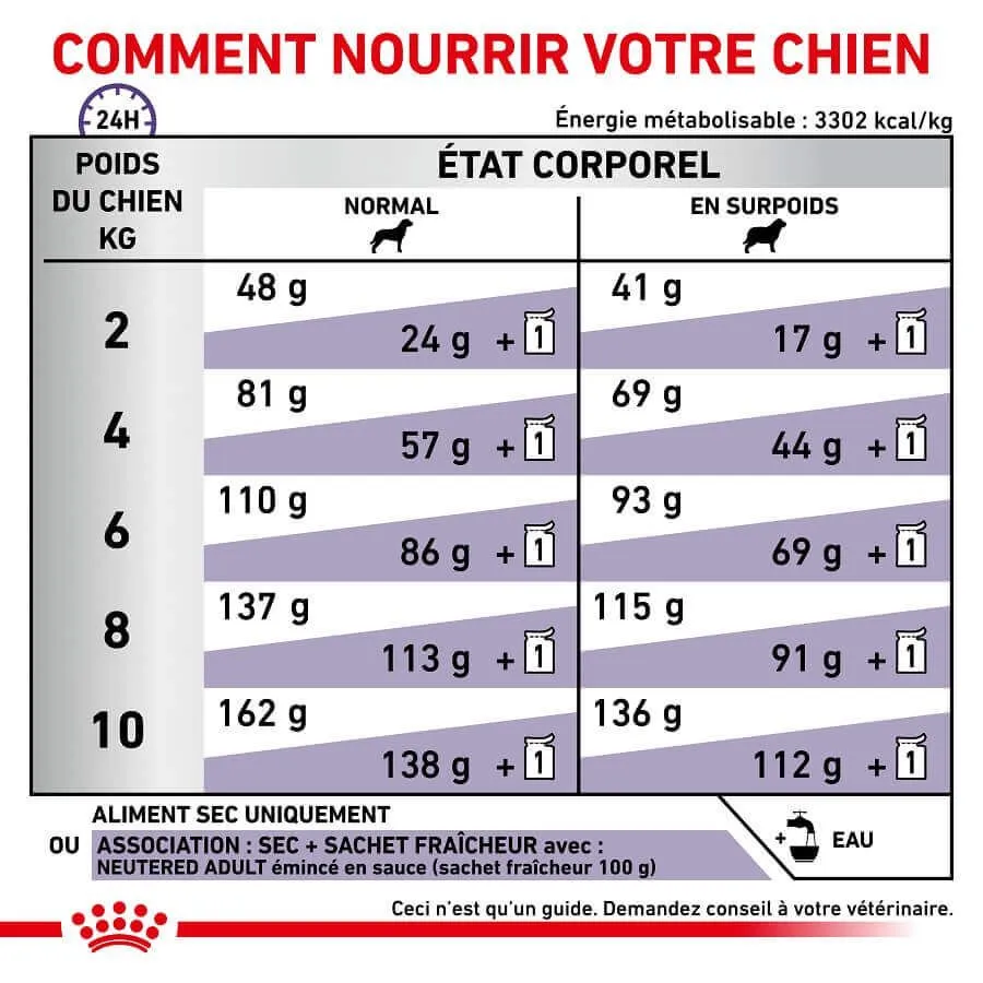 La stĂ©rilisation peut entraĂ®ner des changements relatifs aux besoins Ă©nergĂ©tiques et Ă la rĂ©gulation de l’appĂ©tit, ce qui peut augmenter le risque de prise de poids. Les petites races sont particulièrement sujettes aux problèmes de santĂ© bucco-dentaire comme le tartre. Ils ont tendance Ă Ă©mettre de l’urine en faible quantitĂ©, ce qui peut rendre leur tractus urinaire sensible aux affections. L’alimentation Royal Canin Vet Care Neutered Small Dog rĂ©pond aux besoins spĂ©cifiques des chiens de petite race.Â
