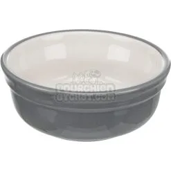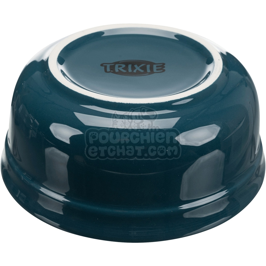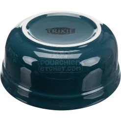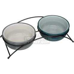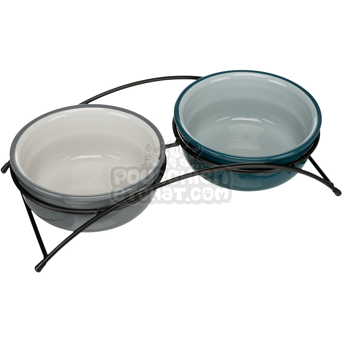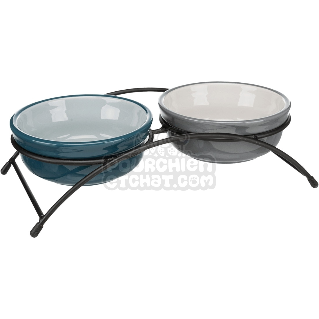 Deux gamelles de couleur pétrole et gris avec leur support. Elles sont en céramique.